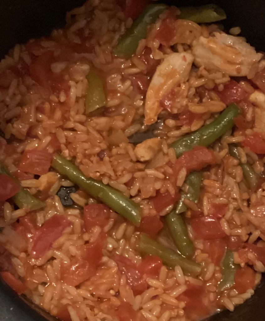 - Restlichen Zutaten dazu geben und kurz kochen lassen bis der Reis gar ist.